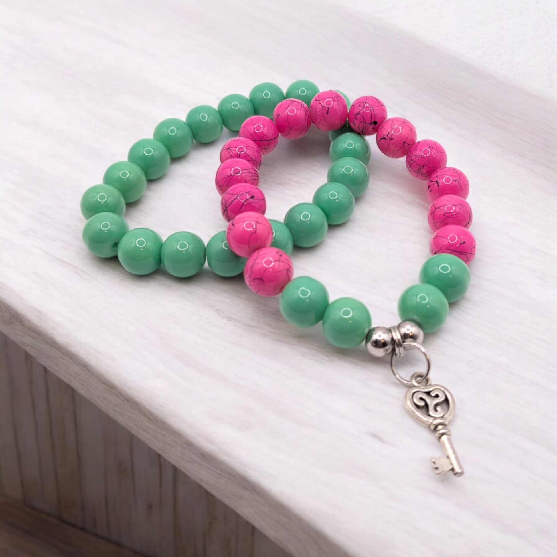 Indulge in the beauty of this exquisite pair of bracelets made with Fruit Punch and Tiffany Green Glass Beads. A silver key charm adds a touch of elegance to the set. Inspired by picturesque and romantic Paris in summertime, this set will captivate you. Each bead measures 10mm, and both bracelets are 6.25in/15.9cm in size. These bracelets are sold as a set.