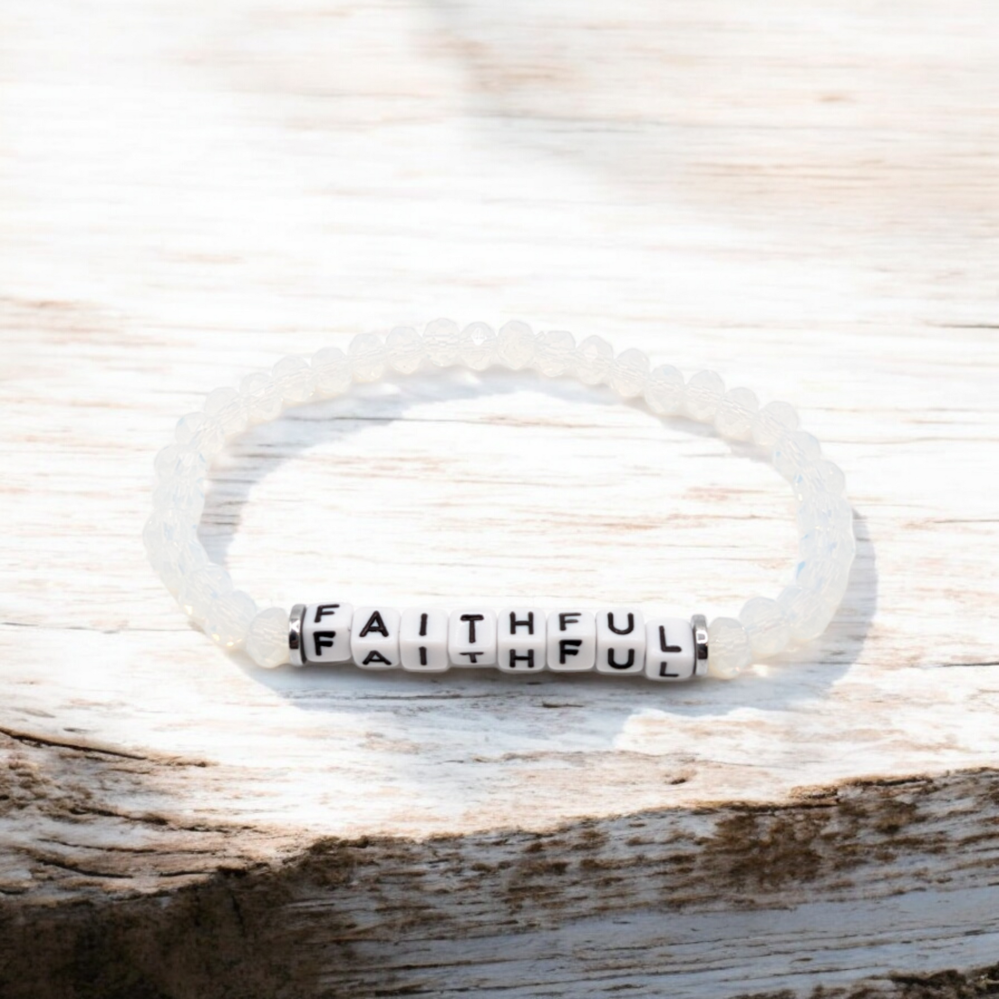 The bracelet is adorned with square beads that spell out the word "Faithful" as a constant reminder of loyalty and steadfastness. Measuring 6.75 inches in length, the "Faithful Sparkle Bracelet" fits comfortably and securely on your wrist, making it perfect for both everyday wear and special occasions. Let this radiant bracelet be a symbol of your faithful spirit and a reminder of the enduring strength that comes from being true to yourself and others.
