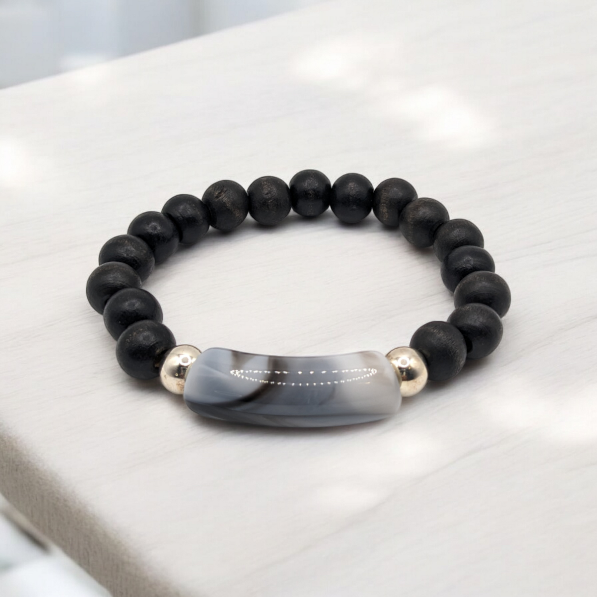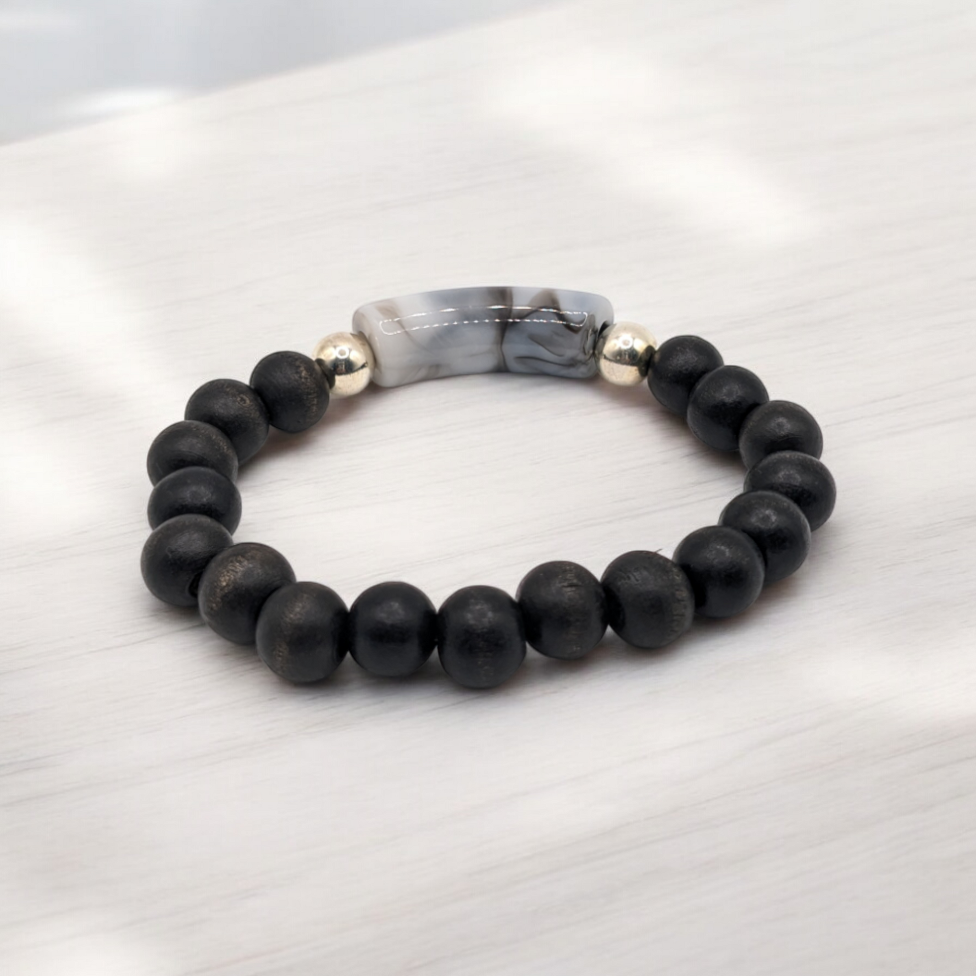 Introducing the "Bamboo Noir Bracelet," a sophisticated semi-bangle-style accessory that effortlessly elevates any outfit. This bracelet features sleek 10mm black wooden beads, offering a bold and timeless look. The focal point is a striking gray chunky tube bamboo bead crafted from acrylic, adding a unique and stylish element to the design.
