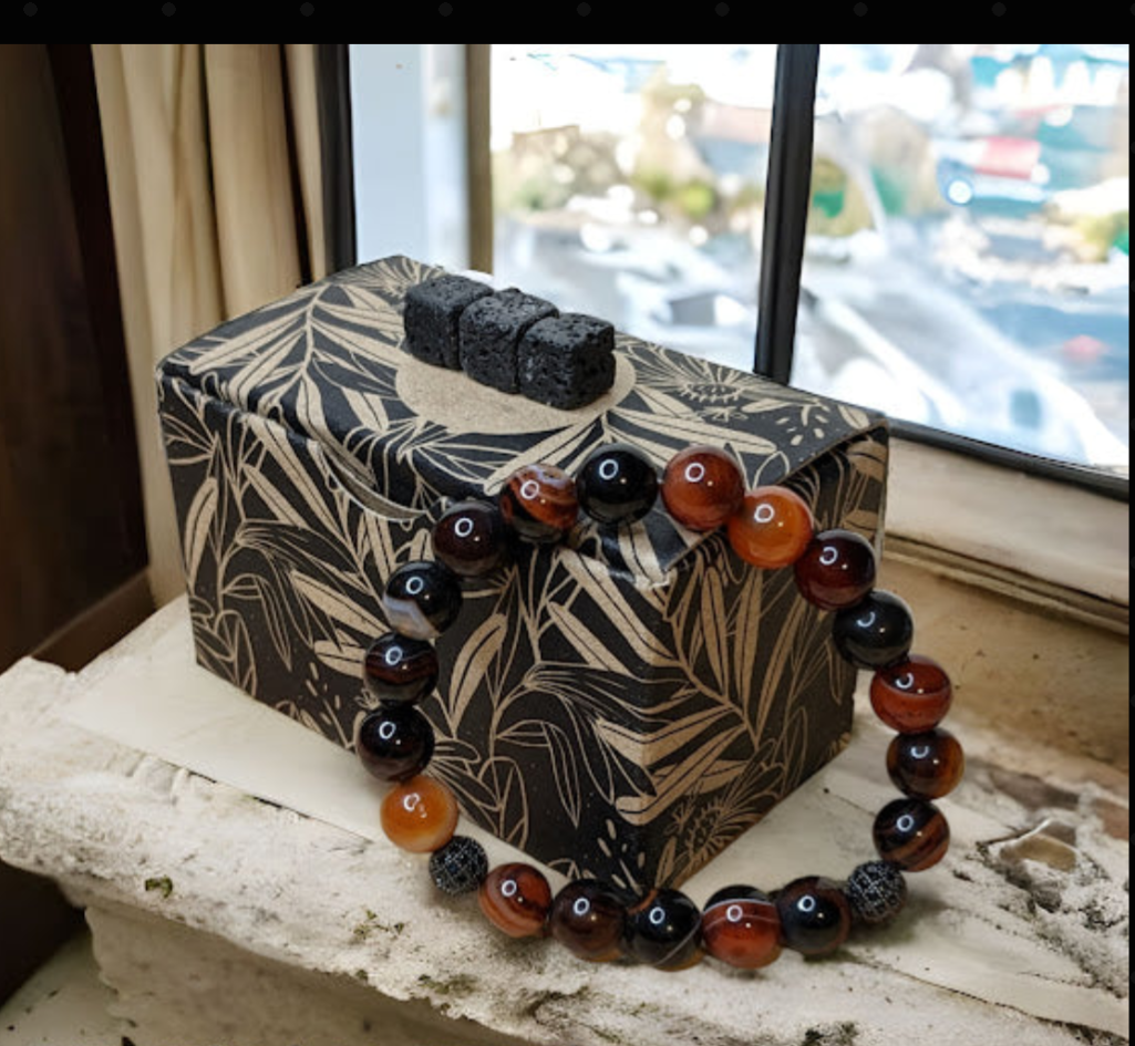 This elegant bracelet is crafted using 10mm Red Coffee Natural Agate Beads and 8mm black rhinestone spacer beads, giving it a sophisticated appearance. The bracelet measures 6.75 inches in size.