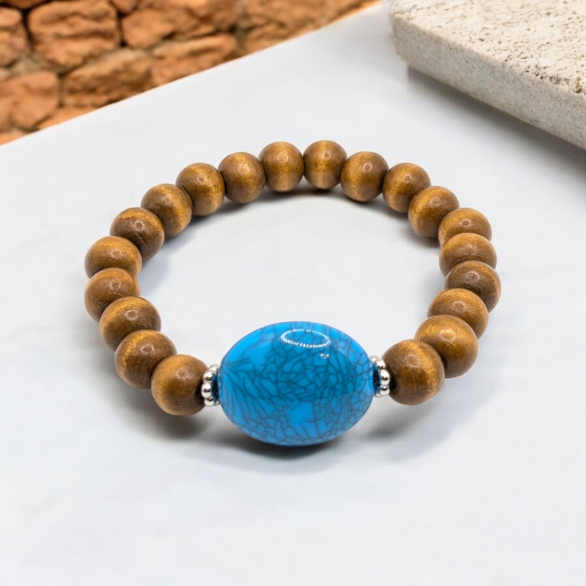 Presenting the "Vintage Forest Turquoise Bracelet" – a stunning accessory that blends natural warmth with timeless elegance. This bracelet is adorned with 10mm wooden beads, giving off an earthy charm that complements any style. A vintage green focal bead at its center adds vibrant color and historical allure, strikingly contrasting the wooden beads.