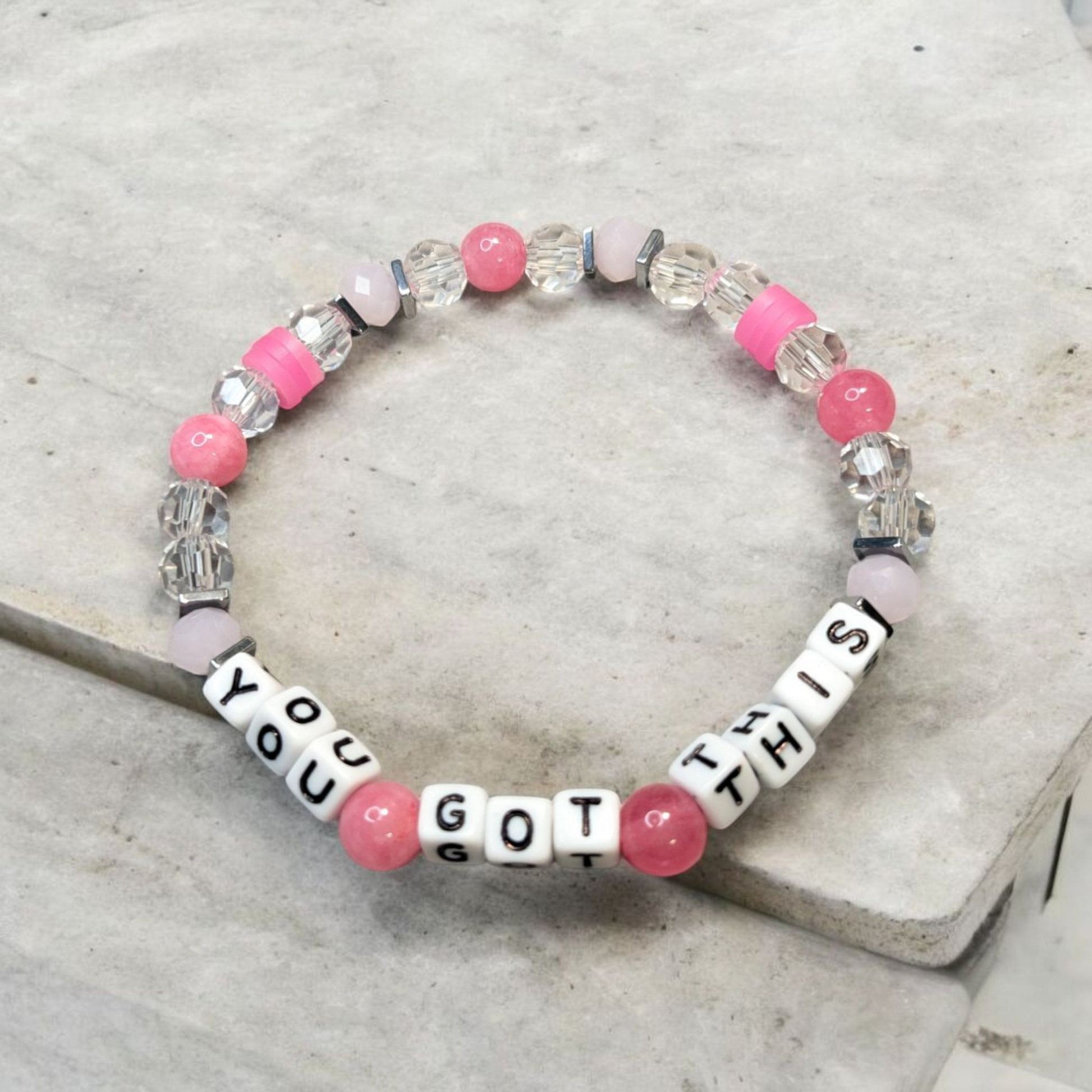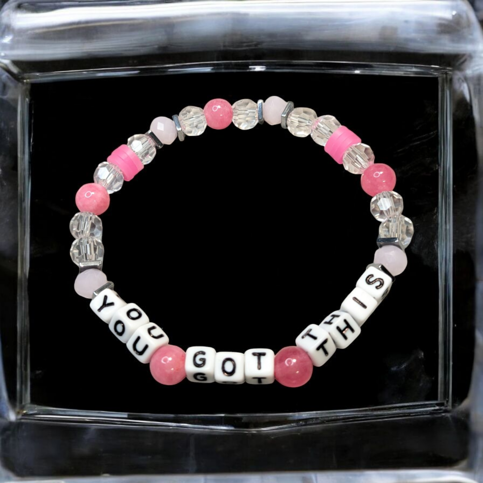 Empower your day with You Got This Glow, a radiant bracelet that uplifts and inspires. Featuring a mix of clear and soft pink beads that catch the light with every move, this piece is accented with sleek silver square hematite spacer beads for a modern, grounded touch. At the center, the words You Got This serve as a bold, encouraging mantra—a daily reminder of your resilience, courage, and unshakable confidence.